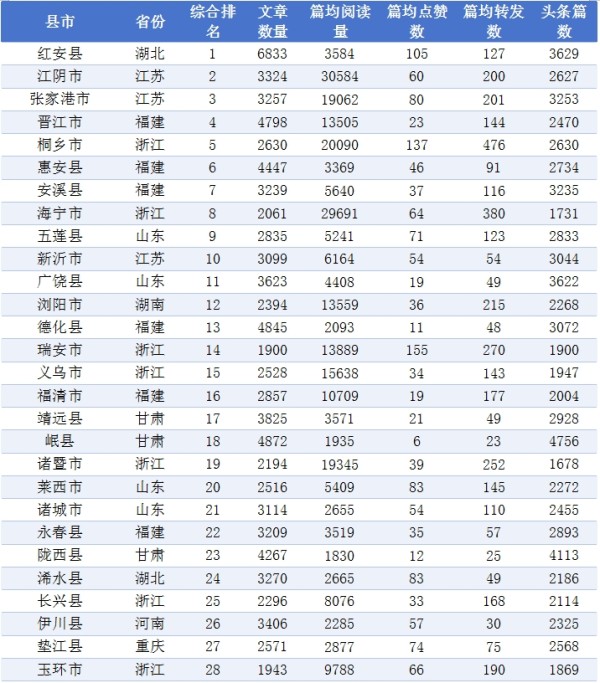 在典型县市中,湖北省红安县以综合排名第一脱颖而出,文章数量高达6833篇,但篇均阅读量相对较低,体现了以量取胜的策略。江苏省江阴市排名第二,篇均阅读量超过3万,显示了高质量内容的传播力。浙江省桐乡市篇均转发数达476,互动性极强;瑞安市篇均点赞数155,位居榜首。新疆巴里坤哈萨克自治县文章数量最多(6438篇),但篇均阅读量仅418,反映出内容质量与数量之间的不平衡。这些案例揭示了融媒体运营中需兼顾数量与质量,以提升整体影响力。