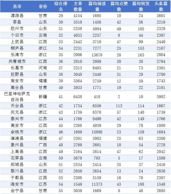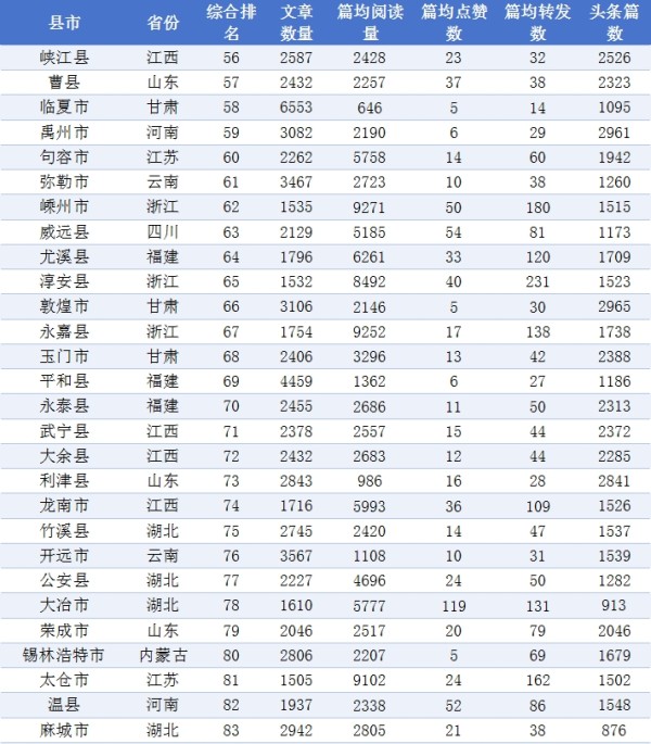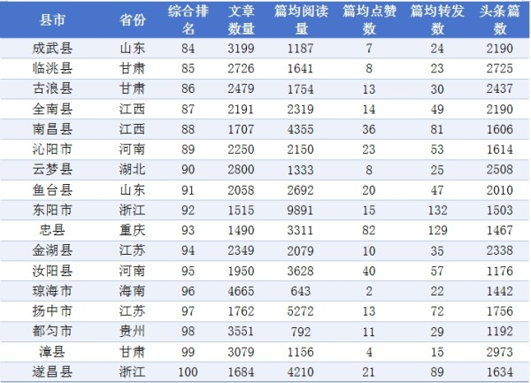 全国县域融媒体微信百强县在传播力上表现突出,文章总数超过28万篇,平均每个县市发布文章约2832篇。篇均阅读量差异显著,最高达3万以上,最低不足500,显示出内容质量和受众覆盖面的不均。篇均点赞和转发数也呈现类似趋势,部分县市互动率极高,而有些则较为平淡。总体来看,东部地区县市在综合排名上占据优势,中西部地区虽有一定表现,但整体影响力较弱。
