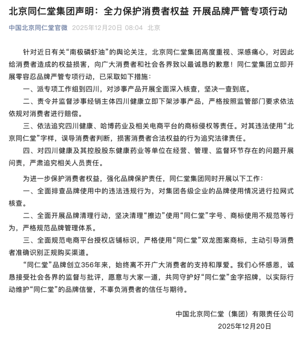 同仁堂集团表示,立即开展零容忍品牌严管专项行动,已采取如下措施:派专项工作组到四川,对涉事产品开展全面深入核查,坚决一查到底;责令并监督涉事经销主体四川健康立即下架涉事产品,严格按照监管部门要求依法依规对消费者进行赔偿;依法追究四川健康、哈博药业及相关电商平台的商标侵权等责任。对其违法使用“北京同仁堂”字样,误导消费者判断,损害消费者合法权益的行为追究法律责任。