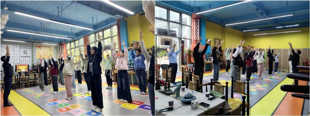 汗水浸湿了衣衫,却挡不住大家的热情。在反复习练中,同学们逐渐感受到身体的变化:僵硬的肩颈慢慢舒缓,紊乱的呼吸趋于平稳,原本紧绷的神经渐渐放松。其中有同学感慨道:"以前总觉得八段锦是老年人的养生方式,亲自练过才发现,每一个动作都需要全身的协调与专注,练完后通体舒畅,这是在书本里学不到的身体体验。"特别是在武学源心法方法论中的站桩体验,开启了大家对对武术站桩的桩功独有的亲身体会。